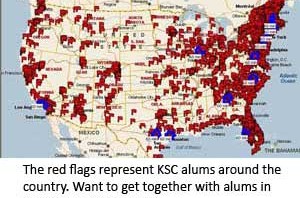 Did you ever wonder how many-if any-KSC alums live in your area? Well you’re in luck, because in 2009, we are hitting the road and hitting it hard to help alums connect in their own backyards!